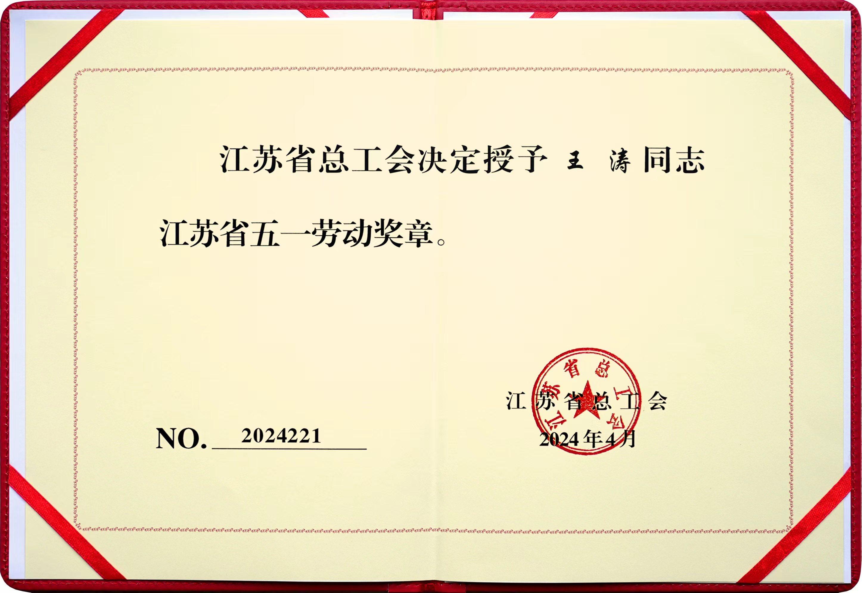 喜訊!王濤榮獲江蘇省五一勞動獎章!